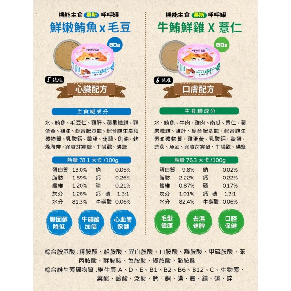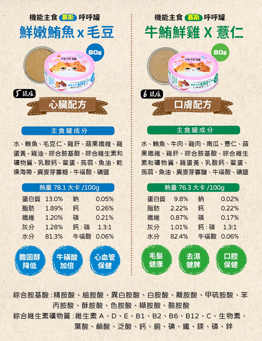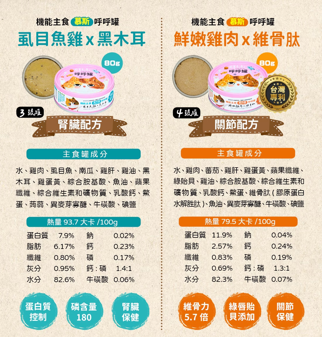 營養分析:蛋白質 13.0%、脂肪1.89%、纖維1.20%、灰分1.28%、水分81.3%、鈉0.05%、鈣0.26%、磷0.21%、鈣:磷 1.3:1、牛磺酸 0.06%、熱量 78.1大卡 /100g