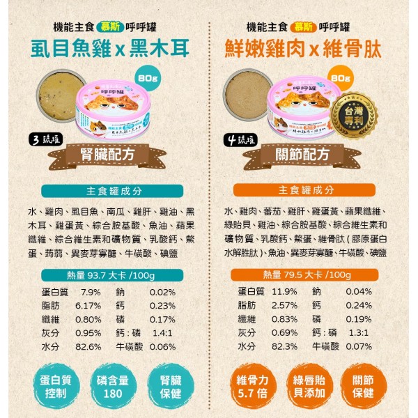 成份: 水、雞肉、虱目魚、南瓜、雞肝、雞油、黑木耳、雞蛋黃、綜合胺基酸、魚油、蘋果纖維、綜合維生素、乳酸鈣、鱉蛋、蒟蒻、異麥芽寡醣、牛磺酸、碘鹽