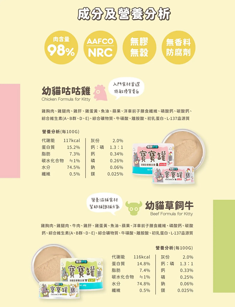 - 成分:雞胸肉、雞腿肉、牛肉、雞肝、雞蛋黃、魚油、蘋果、洋車前子膳食纖維、磷酸鈣、碳酸鈣、綜合維生素(A、B群、D、E)、綜合礦物質、牛磺酸、離胺酸、初乳蛋白、L-137益源質。