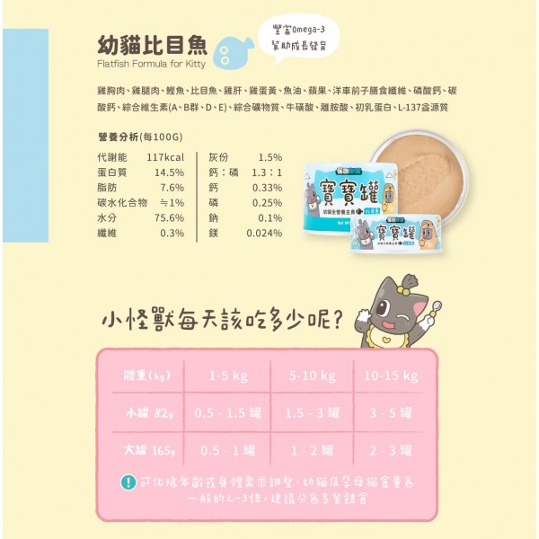 ✔每日建議量:體重1~5kg 0.5~1.5罐、體重5~10kg 1.5~3罐、體重10~15kg 3~5罐
