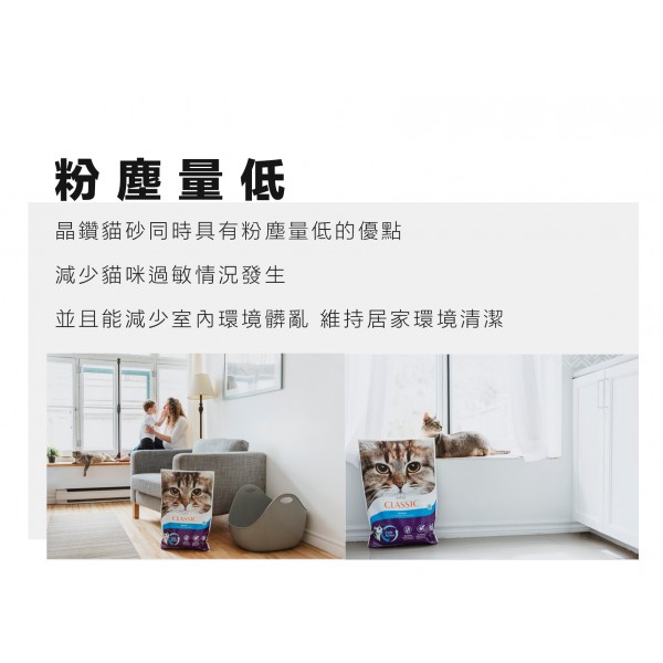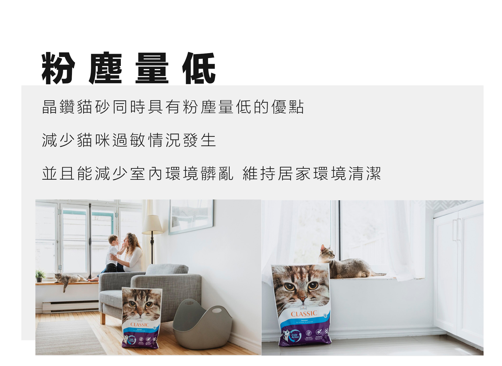 晶鑽貓砂同時具有粉塵量低的優點,減少貓咪過敏情況發生,並且能減少室內環境髒亂,維持居家環境清潔。