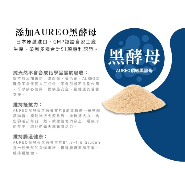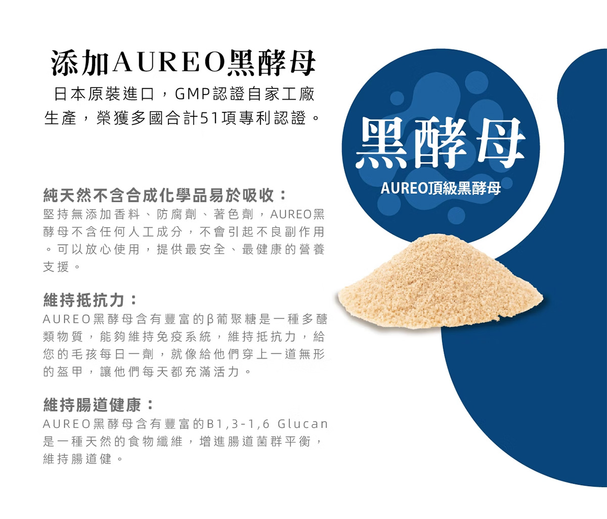 ✔ 添加 AUREO黑酵母:含有豐富的B葡聚糖是一種多醣類物質、天然的食物纖維。
