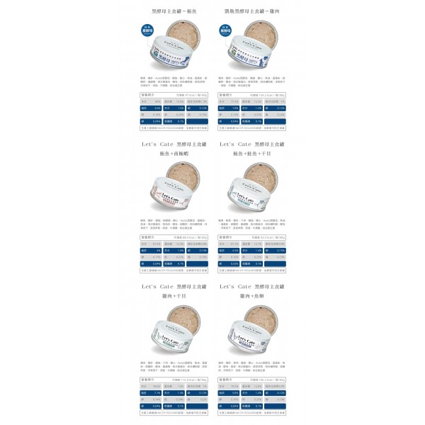 口味:黑酵母+鮪魚、黑酵母+雞肉、鮪魚+南極蝦、鮪魚+鮭魚+干貝、雞肉+干貝、雞肉+魚卵