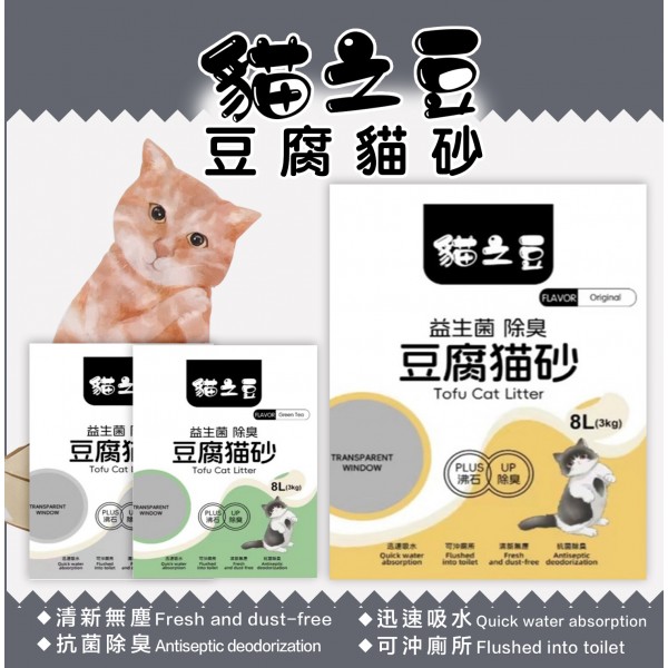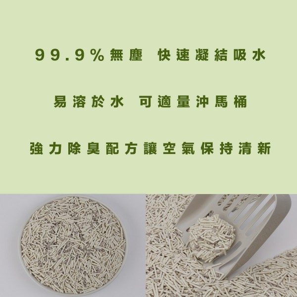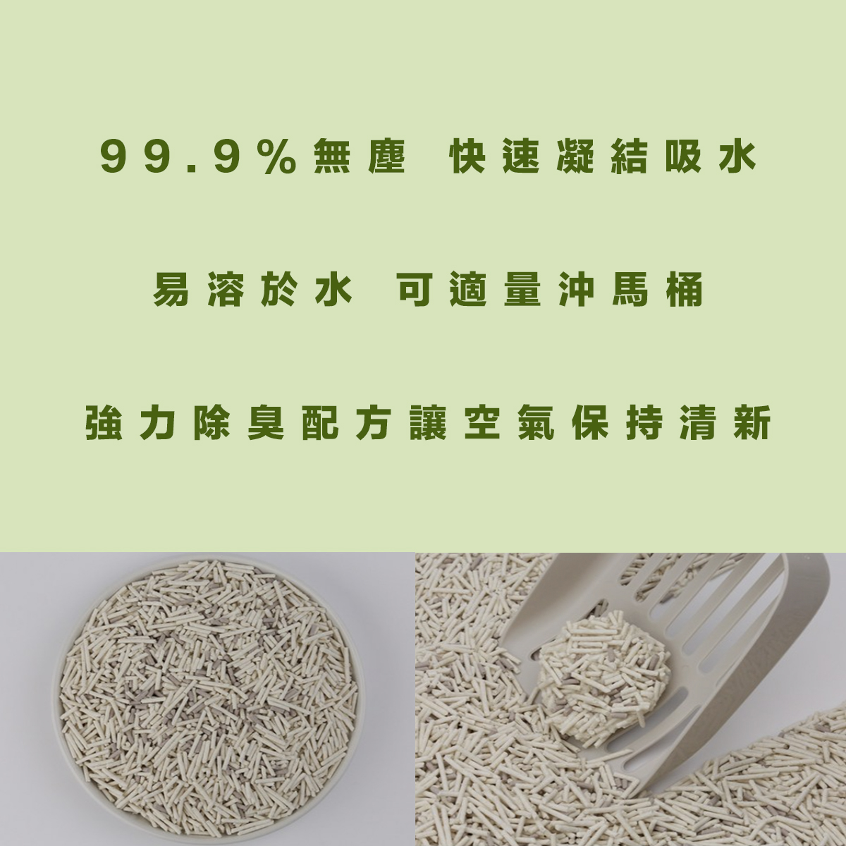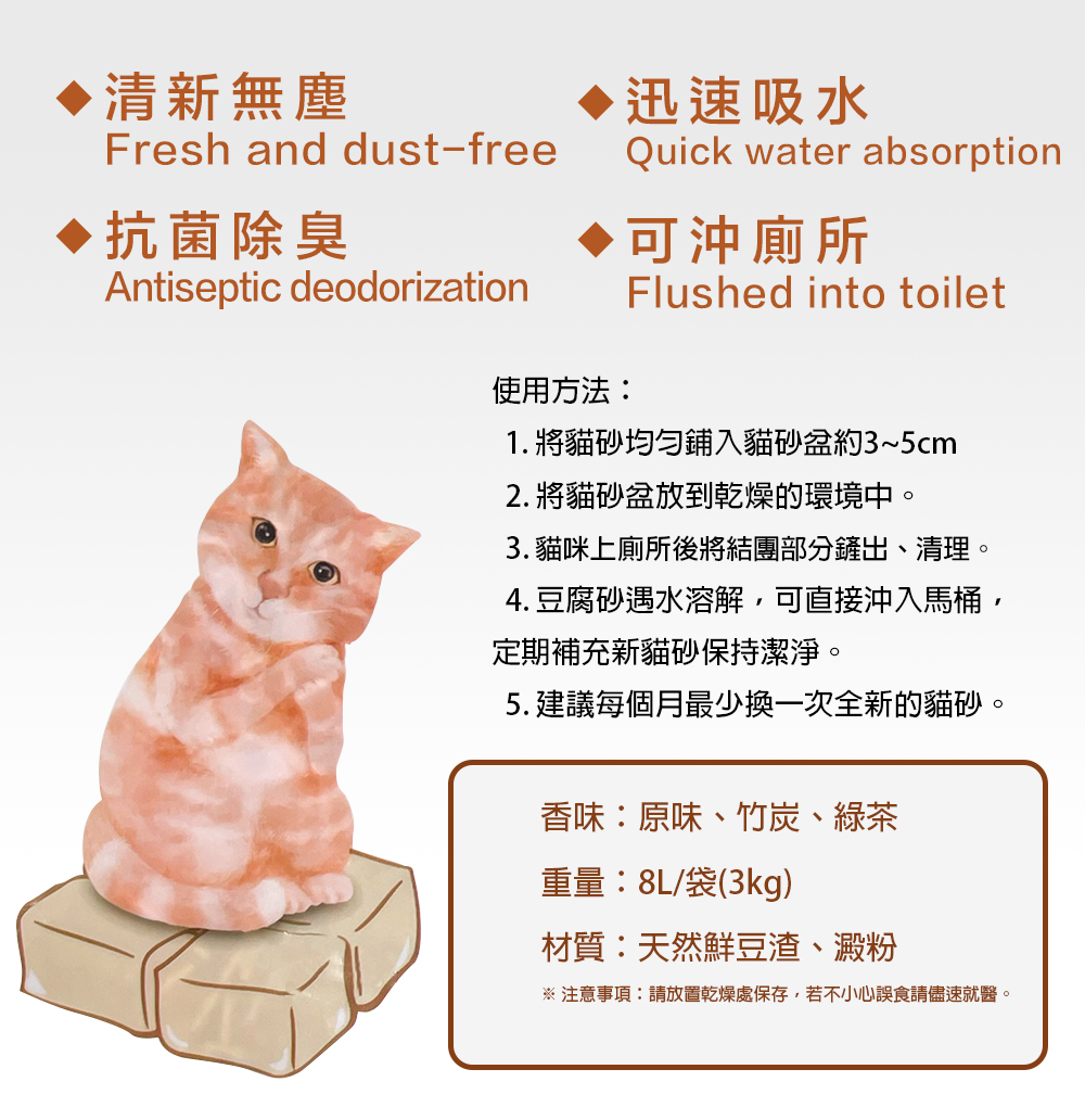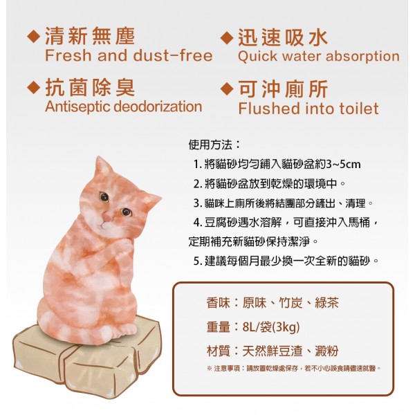 豆腐砂遇水溶解,可直接沖入馬桶,定期補充新貓砂保持潔淨。