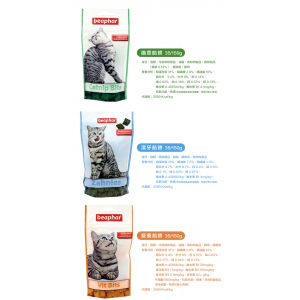 成分:穀類、牛奶和奶製品、油脂、肉和肉製品、植物製品(貓草0.12%)、礦物質、酵母