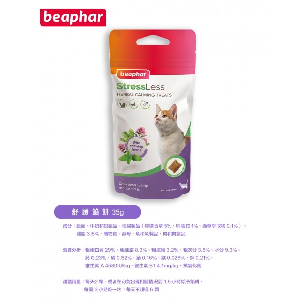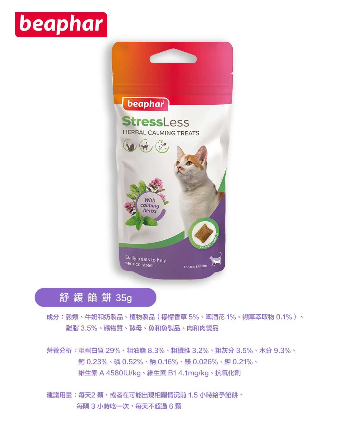 成分:穀類、牛奶和奶製品、植物製品(檸檬香草5%、啤酒花1%、纈草萃取物0.1%)、雞脂3.5%、礦物質、酵素、魚和魚製品、肉和肉製品