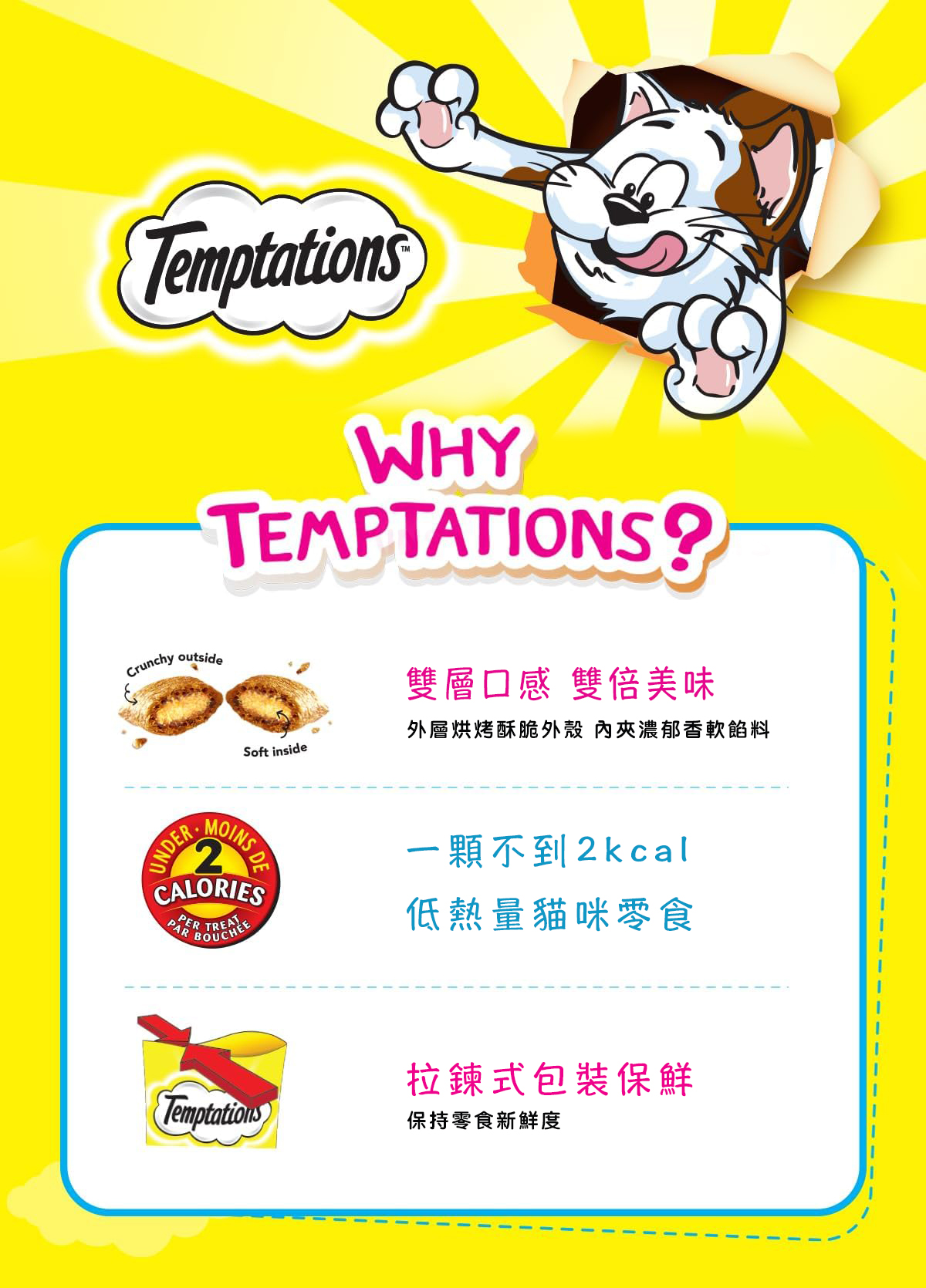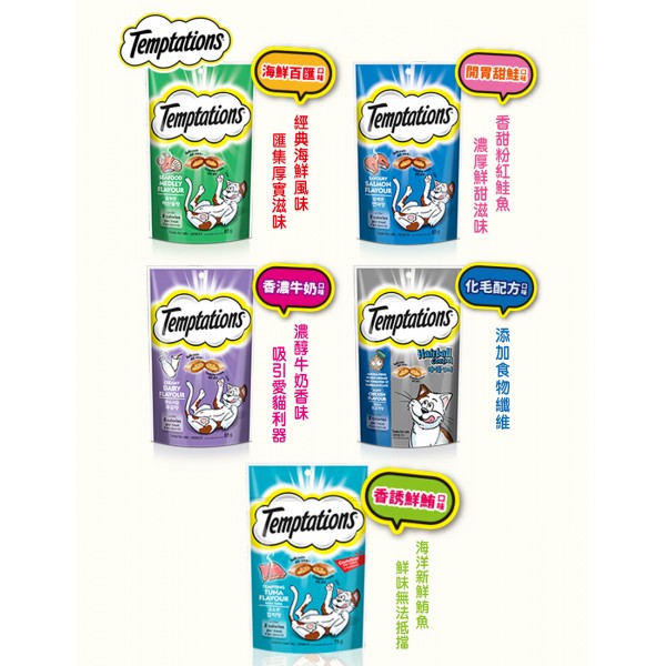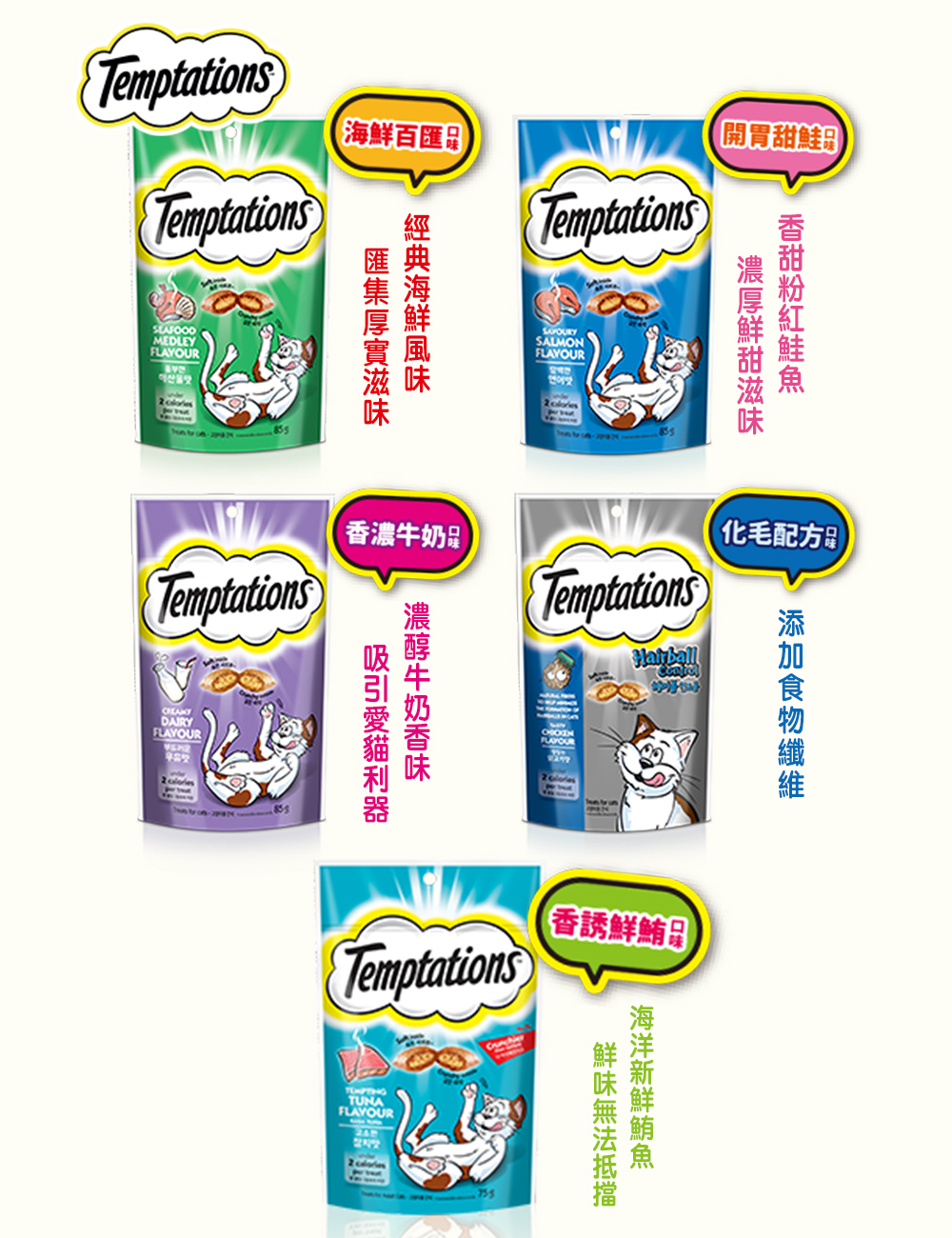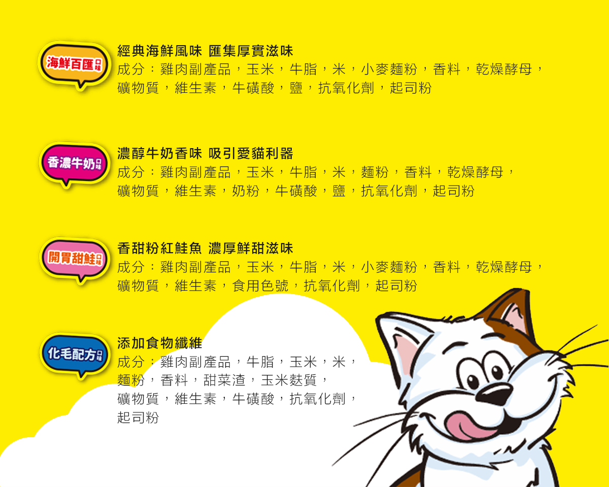 成份:禽肉副產品、穀類(玉米及米)、牛副產品(牛脂、牛血漿)、小麥麵粉、禽類水解物、雞油、乾燥酵母、香料、礦物質、維生素、氨基酸、貓薄荷、著色劑(食用黃色四號、食用藍色二號、食用黃色五號、食用紅色六號)、抗氧化劑、起司粉