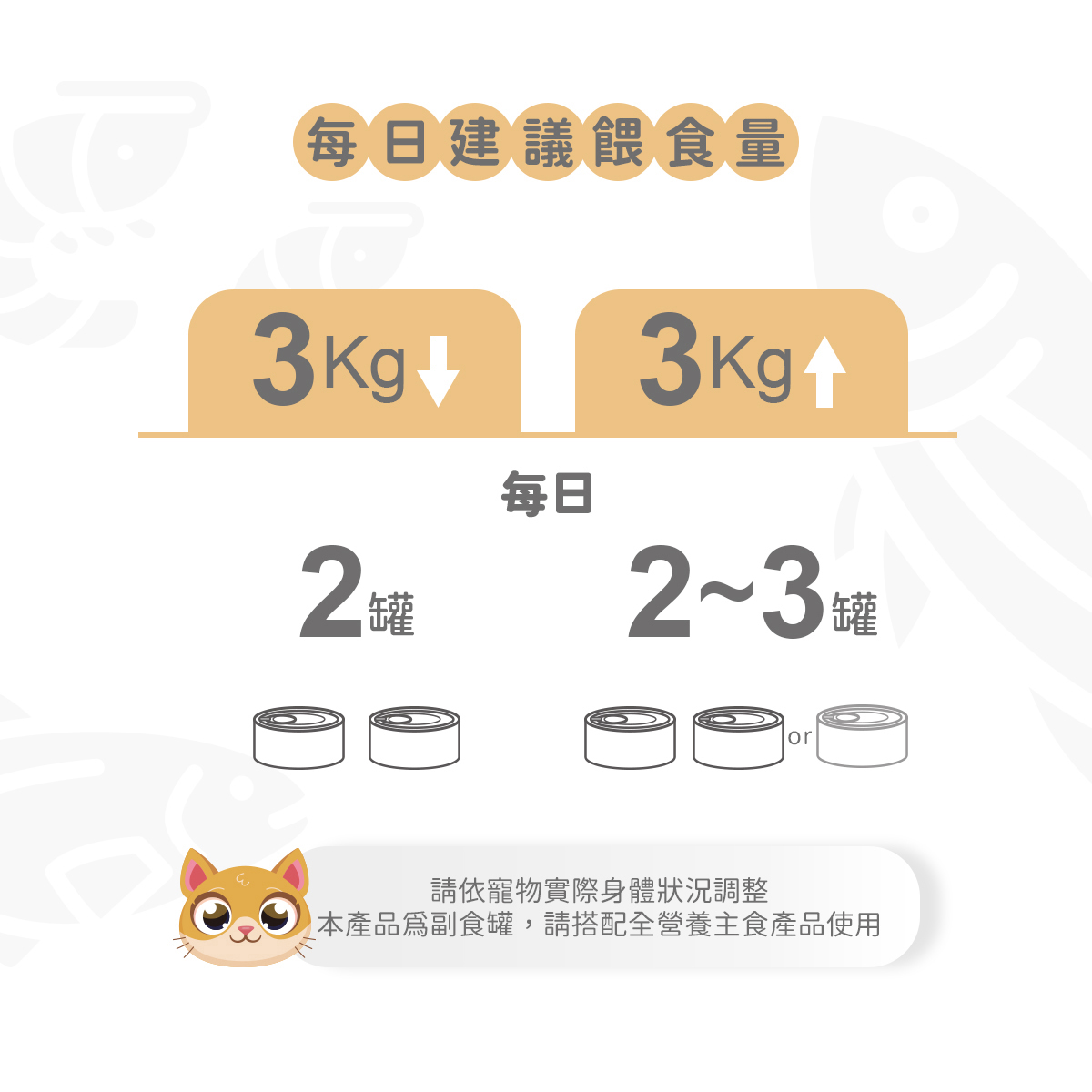 食用方式: 3kg以下每日2罐,3kg以上每日2~3罐 (請依寵物實際身體狀況調整)
