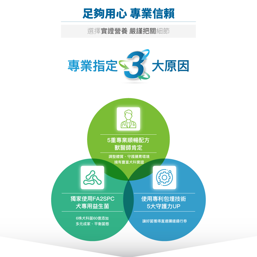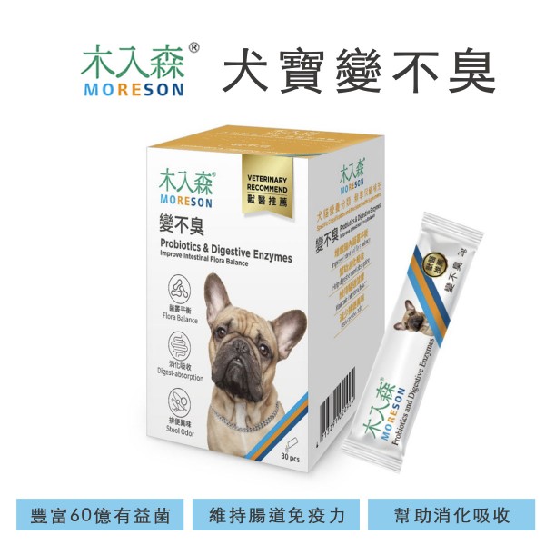 木入森 犬寶變不臭,狗狗益生菌全新升級,黃金有益菌提升至 60 億,獨家使用 FA2SPC 犬用專科益生菌,皆選擇犬腸優勢菌,精準模擬狗狗健康腸型態,搭配好菌ABC鐵三角,針對狗狗飲食幫助消化,使排便穩定正常。