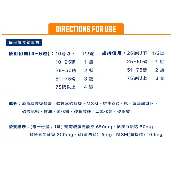 營養標示:(每一份量 / 1錠)葡萄糖胺鹽酸鹽 650mg、抗壞血酸鈣 50mg、軟骨素硫酸鹽 200mg、錳(蛋白錳) 5mg、MSM(有機硫) 100mg