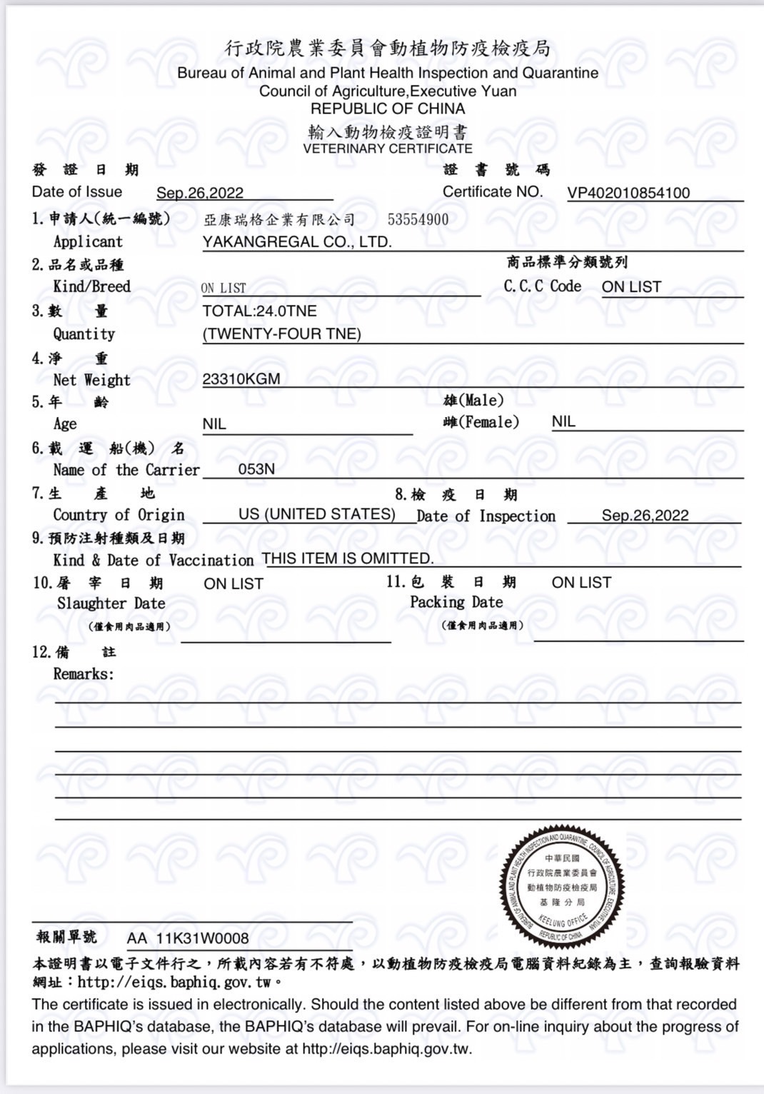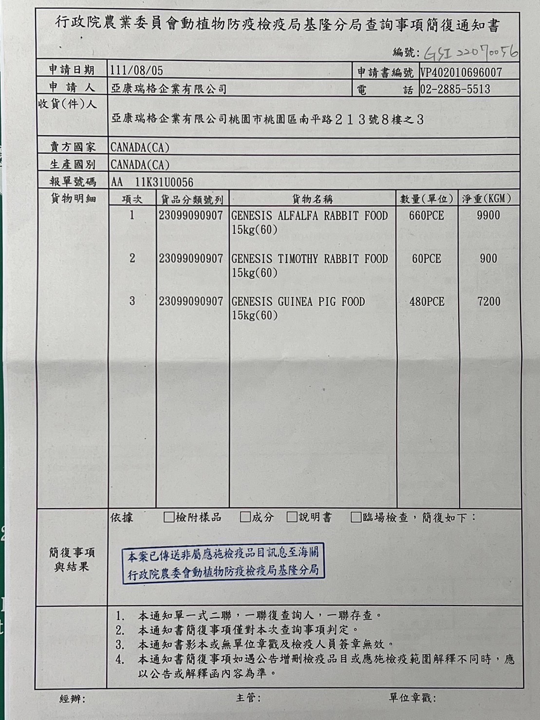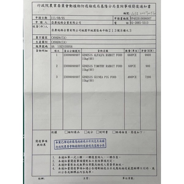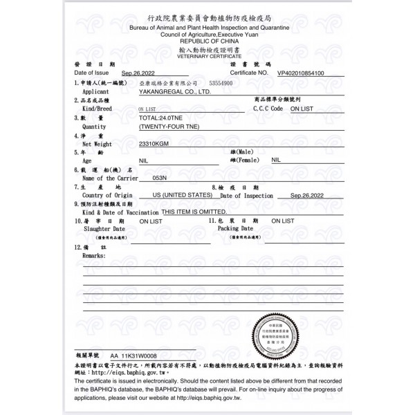 成份分析:粗蛋白15%、粗脂肪2.5%、粗纖維18.0%、水分10.0%、粗灰分6.39%、維生素A 17600 IU/kg、維生素D3 2000 IU/kg、維生素C 600 mg/kg、維生素E 55 mg/kg、鈣0.80%、磷0.50%、鉀1.19%、鈉0.20%、鎂0.36%、銅15 mg/kg、鋅(氧化鋅)75 mg/kg、錳(如氧化錳)60 mg/kg、鐵75 mg/kg、碘1.1 mg/kg、碳酸鈷1.5 mg/kg、硒(如亞硒酸鈉)0.2 mg/kg、歐米加3脂肪酸0.04%。